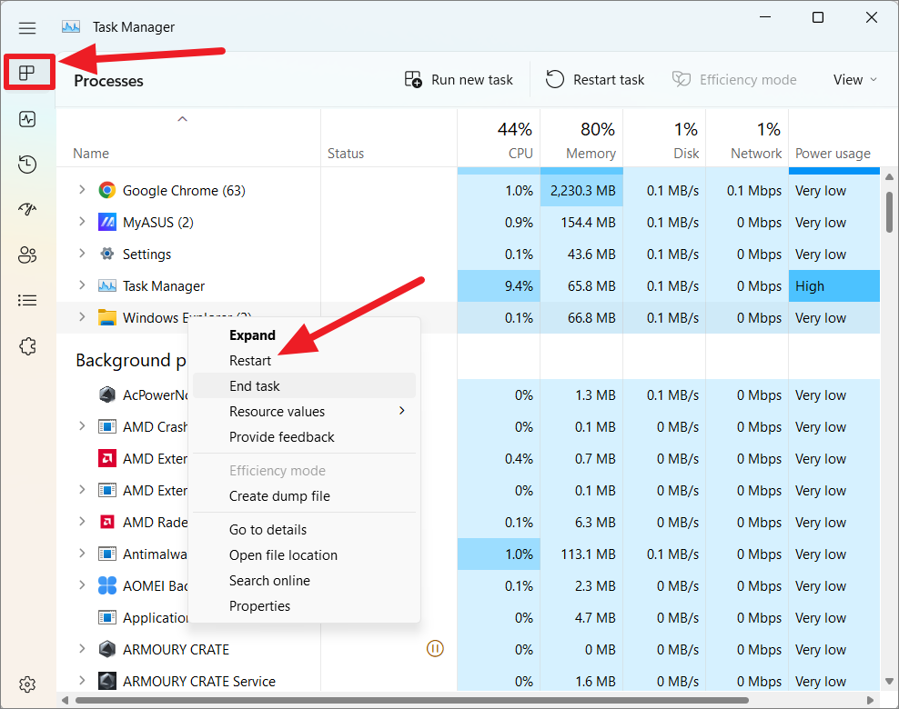 Una volta trovato il processo di Esplora risorse, fai clic con il pulsante destro del mouse su di esso e seleziona”Riavvia”dal context menu.