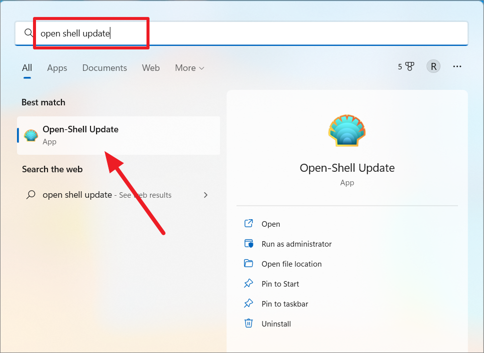 Open the Start menu. Then, search for ‘Open Shell update‘, and select the program from the result.