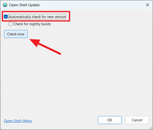 In the Open Shell update window, ensure the ‘Automatically check for new version’ option is checked and click on the ‘Check now’ button. If you have any pending updates, the app will download and install them.