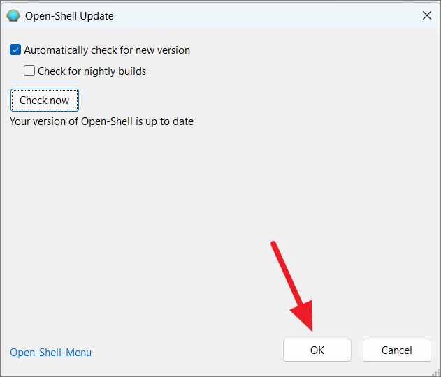 And when you see ‘Your version of Open Shell is up to date’, click ‘OK’.