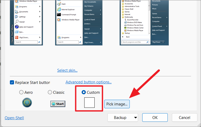 With Open-Shell, you can also use un’icona personalizzata come pulsante del menu Start. To do that, select the’Custom’option under Replace Start button and click the’Pick image’button.
