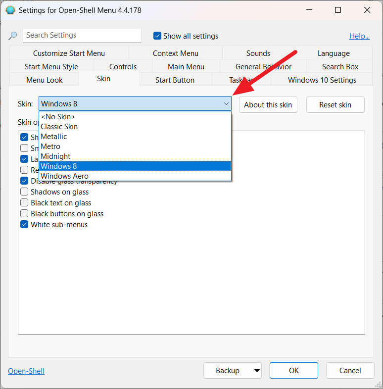 Puoi anche cambiare le skin del menu Start per cambiarne l’aspetto. To do that, switch to the’Skins’tab and choose a skin from the drop-down menu.