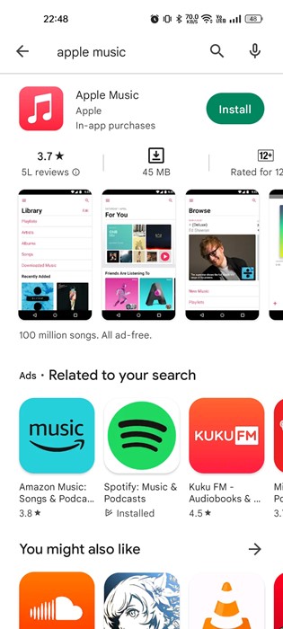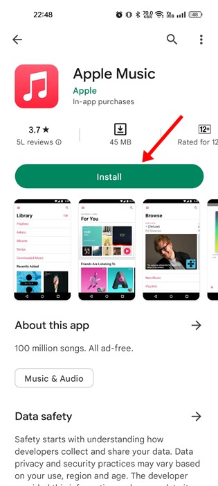3. Nella pagina dell’elenco dell’app Apple Music, tocca il pulsante Installa per installare l’app sul tuo smartphone Android.