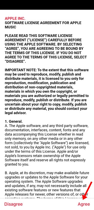 2. Quando Apple Music si apre per la prima volta, ti chiederà di accettare i termini e le condizioni. Tocca il pulsante Accetto.