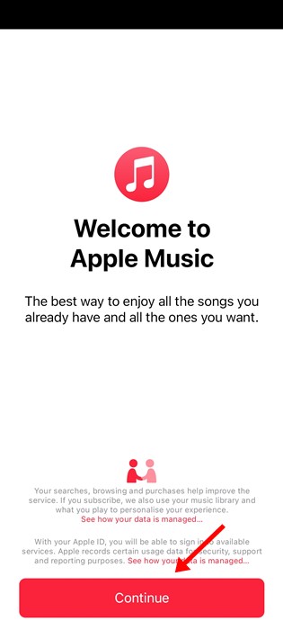 3. Ora vedrai la schermata Benvenuto in Apple Music. Qui devi toccare il pulsante Continua.