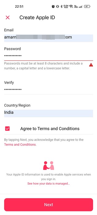 5. Quindi, inserisci i dettagli richiesti per creare l’ID Apple. Al termine, tocca il pulsante Avanti.