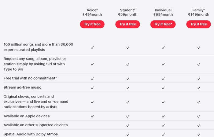 Come accennato in precedenza, Apple Music ha quattro diversi piani. Devi scegliere quello che si adatta al tuo budget e soddisfa le tue esigenze musicali. Controlla l’immagine qui sotto per conoscere i piani disponibili insieme ai prezzi.