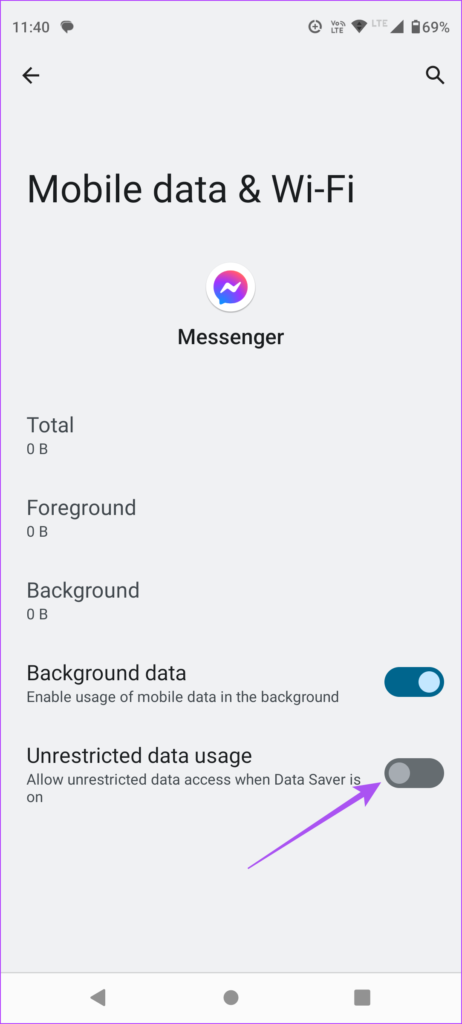 Se hai ancora attivato Risparmio dati sul tuo telefono Android, ti suggeriamo di consentire l’utilizzo illimitato dei dati per l’app Messenger. Ciò assicurerà che l’app sia in grado di utilizzare l’intera larghezza di banda della tua connessione Internet per ricevere chiamate.