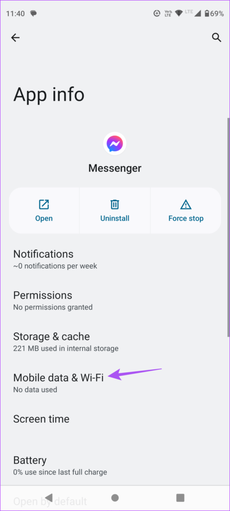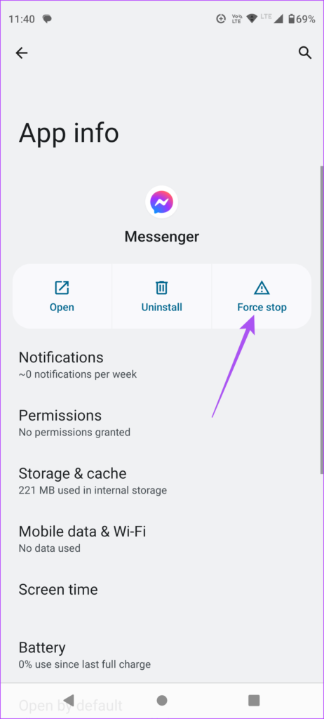 L’app cache memorizza tutte le informazioni critiche come le credenziali del profilo e le preferenze dell’app per migliorare la reattività della tua esperienza utente. Puoi svuotare la cache dell’app per Messenger e verificare se questo risolve il problema.