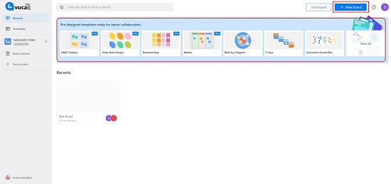 2. Una volta effettuato l’accesso, verrai indirizzato alla dashboard VUCAC dove potrai iniziare una nuova bacheca da zero o utilizzare i modelli predefiniti per semplificare il tuo lavoro.
