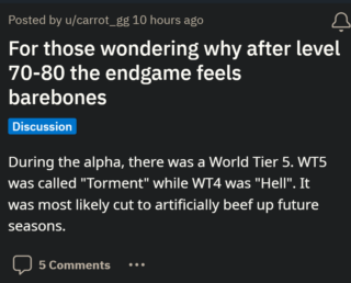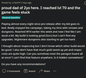 Uno degli interessati dice che dopo aver raggiunto il livello 70 e aver completato la campagna, non riescono a trovare alcun potenziamento e i dungeon dell’Incubo stanno diventando troppo impegnativi.