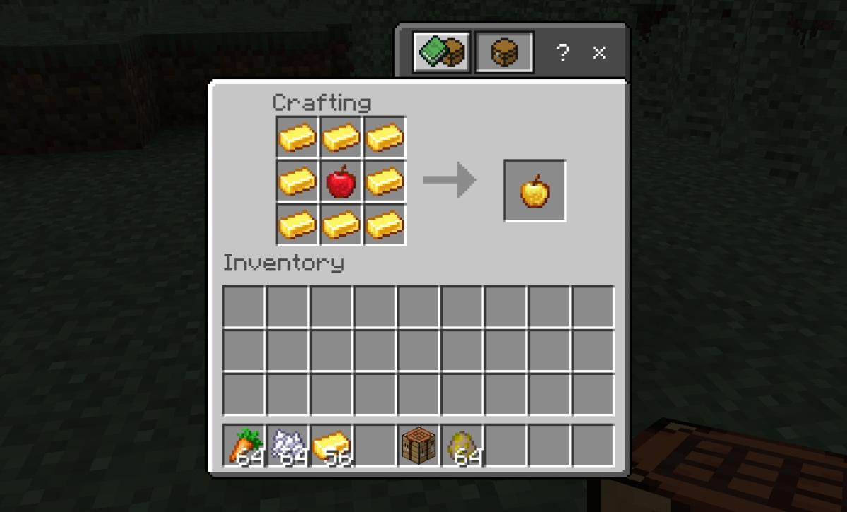 Apri il tavolo di creazione. Metti la mela o la carota (quella che stai usando) nella cella centrale, cioè la seconda cella della seconda riga. Metti i lingotti d’oro in tutte le celle rimanenti. Raccogli la mela d’oro o la carota.