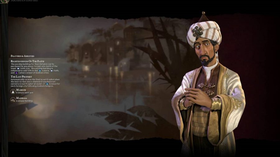 科学の勝利への伝統的でない道を探している上級プレイヤーは、技術と宗教を混ぜ合わせてどちらかの勝利を達成するユニークな能力を持つサラディンを楽しむでしょう。アラビアの宗教的建造物は科学、文化、信仰を 10% 向上させ、そのボーナスはアラビアの宗教に従う都市ごとに、ターンごとに科学の 1 ユニットを追加で生成します。