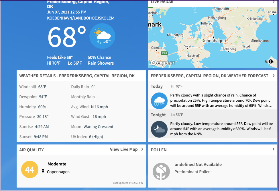 現在の気温をクリックすると、WeatherBug はユーザーを Web サイトにリダイレクトします。ここでは、天気の詳細な内訳を見つけることができます。このサイトには、現在の空気の質に加えて、今日と今夜の気温の概要が書かれています.