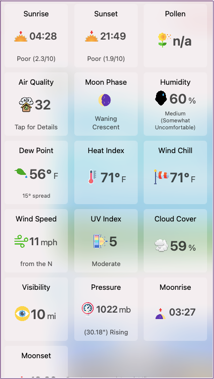 ただし、現在の予測をクリックすると、他の多くのオプションが表示されます。予報バーは、月の出と日の入りに加えて、雲量、風速、可視性などを表示します。