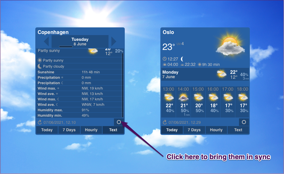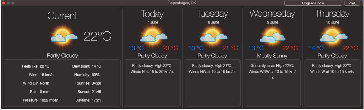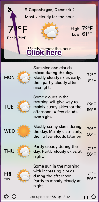 Forecast Bar は、あなたの地域の天気の包括的な概要を提供します。コンピューターのツールバーの上部にあるアイコンを初めてクリックすると、現在の屋外の様子が簡単に説明されます。