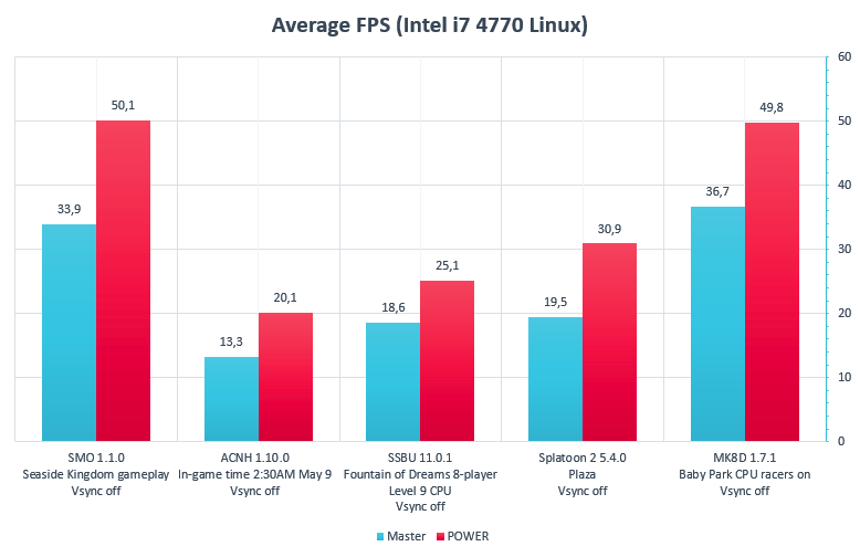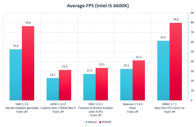 - スプラトゥーン2:インコポリススクエアでテスト済み。これはNPCの数が最も多く、通常はゲーム内のどこでもFPSが最も低くなります。この特定の領域は、スイッチで30FPSにロックされていることに注意してください。テストしたすべてのPCでこれらの変更がすでに30に達しているため、テスト目的でキャップを解除する必要がありました。