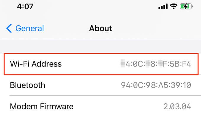 AppleによってiPhoneに割り当てられた静的MACアドレスを確認するには、設定> 一般> 概要に移動してを確認しますWi-Fiアドレスの行。