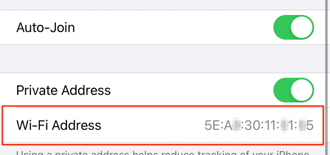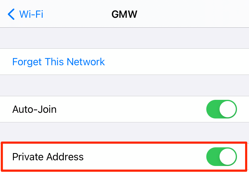 iOSの場合は、Wi-Fi設定メニュー(設定> Wi-Fi )に移動し、アクティブなWi-Fiネットワークをタップして、をオフに切り替えます。 >プライベートアドレスオプション。