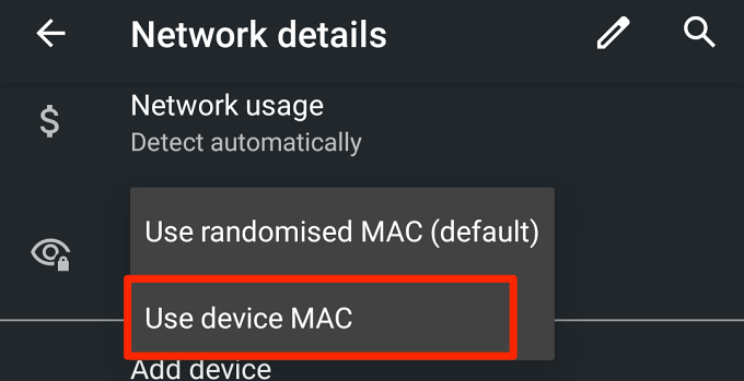 [デバイスMACを使用]を選択して、MACアドレスのランダム化を無効にします。