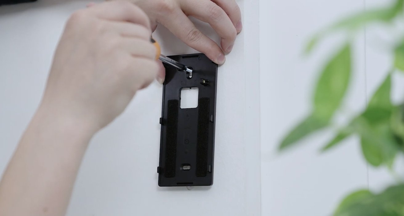 星形のネジでドアベルを右側に固定する前に、ドアベルを取り付けプレートの上に滑り込ませます。ネジの頭が変わっているため、泥棒がドアベルを持って出発するのは難しくなりますが、電池を交換するのは面倒です。