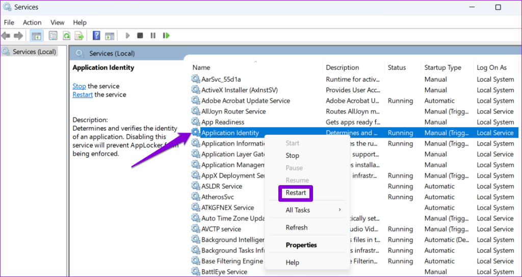 ステップ 2: Application Identity サービスを右クリックし、[再起動] を選択します。