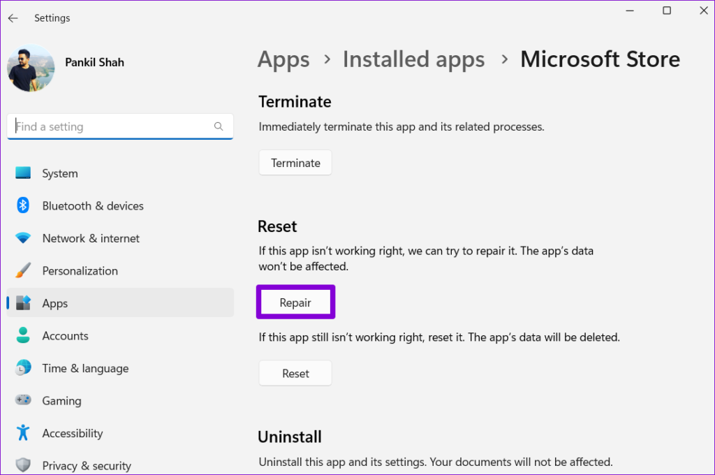 修復を試みてもエラーが解決しない場合は、Microsoft Store をリセットしてみてください。同じメニューからアプリを起動します。これにより、既存のアプリ データがすべて削除され、Microsoft Store がデフォルトの状態に復元されます。