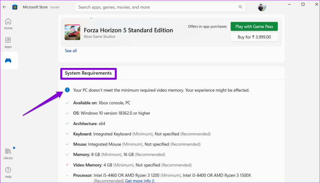 アプリまたはゲームの最小システム要件を確認するには、Microsoft Store で検索してください。 「システム要件」セクションには、仕様のリストと、PC がそれらの要件を満たしているかどうかを示すメッセージが表示されます。