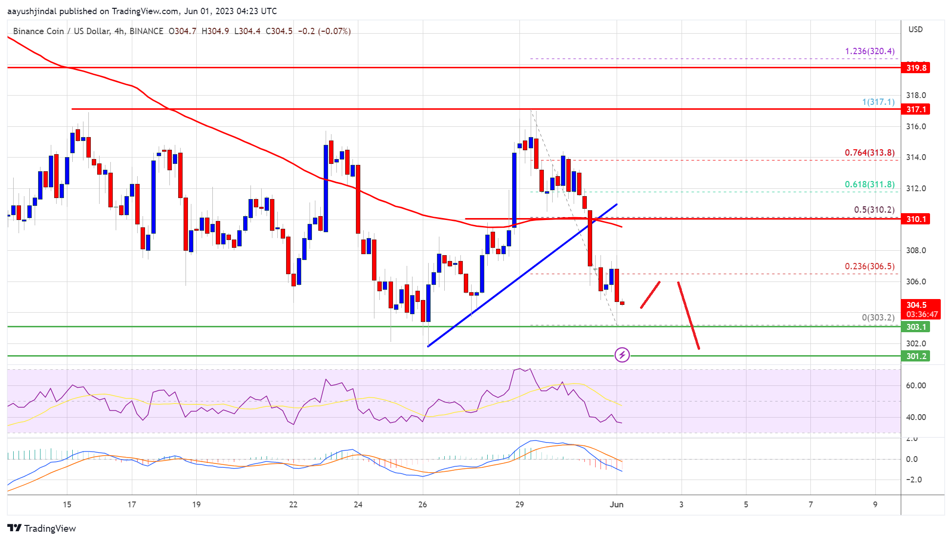 317.1 ドル付近で高値が形成され、価格は新たな下落を開始しました。 312ドルと310ドルのレベルを下回る動きは明らかでした。 BNB/USD ペアの 4 時間足チャートでは、310 ドル付近がサポートとなる重要な強気トレンドラインを下抜ける場面もありました。