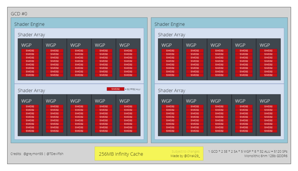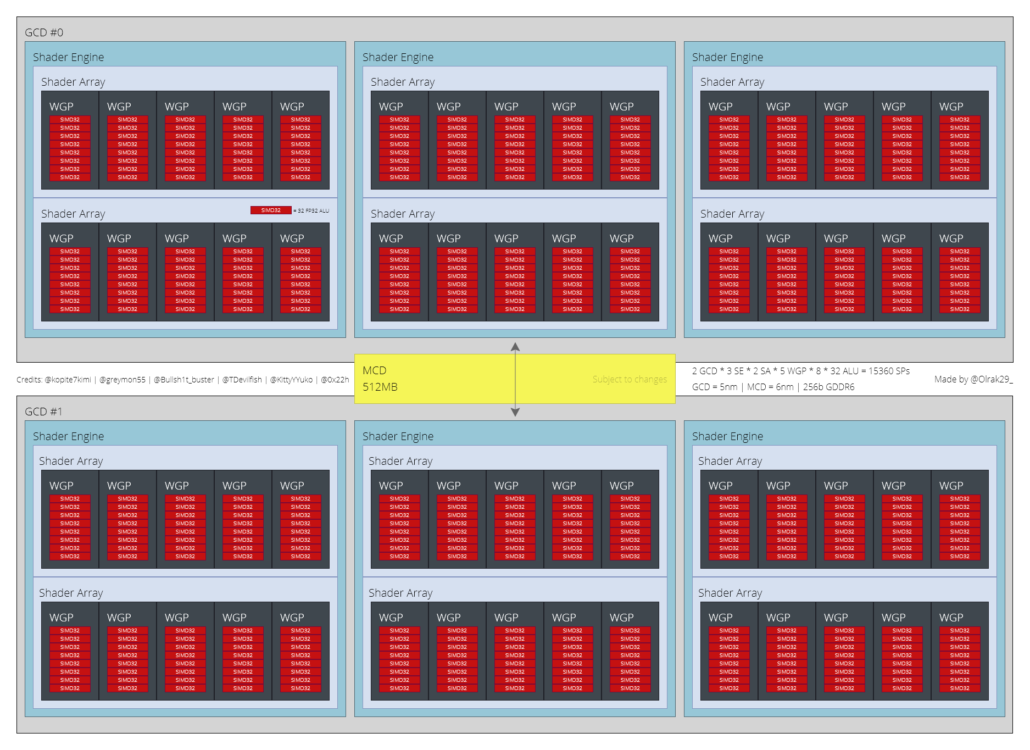 フラッグシップのRadeonRX7700に電力を供給するAMDの次世代RDNA3ベースのNavi32GPUの予備ブロック図XTグラフィックカード。 (画像クレジット:Olrak)