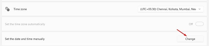ステップ5。今すぐ[日付と時刻を手動で設定する]オプションの後ろにある[変更]ボタンをクリックします。日付と時刻を手動で変更するには、最初に手順4でオプションを無効にする必要があります。