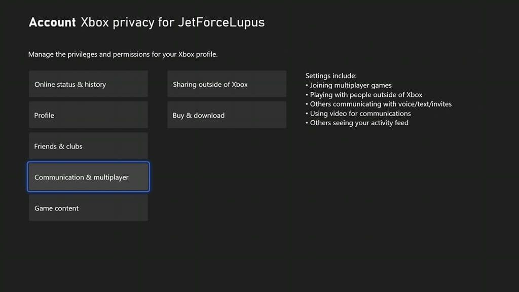 マルチプレイヤーゲームへの参加、クロスプレイへの参加、他のユーザーとのコミュニケーションが許可されていること、および他のユーザーがあなたとのコミュニケーションを許可されていることを確認します。全体的に、これらの設定は許可、許可、全員、全員に設定する必要があります。