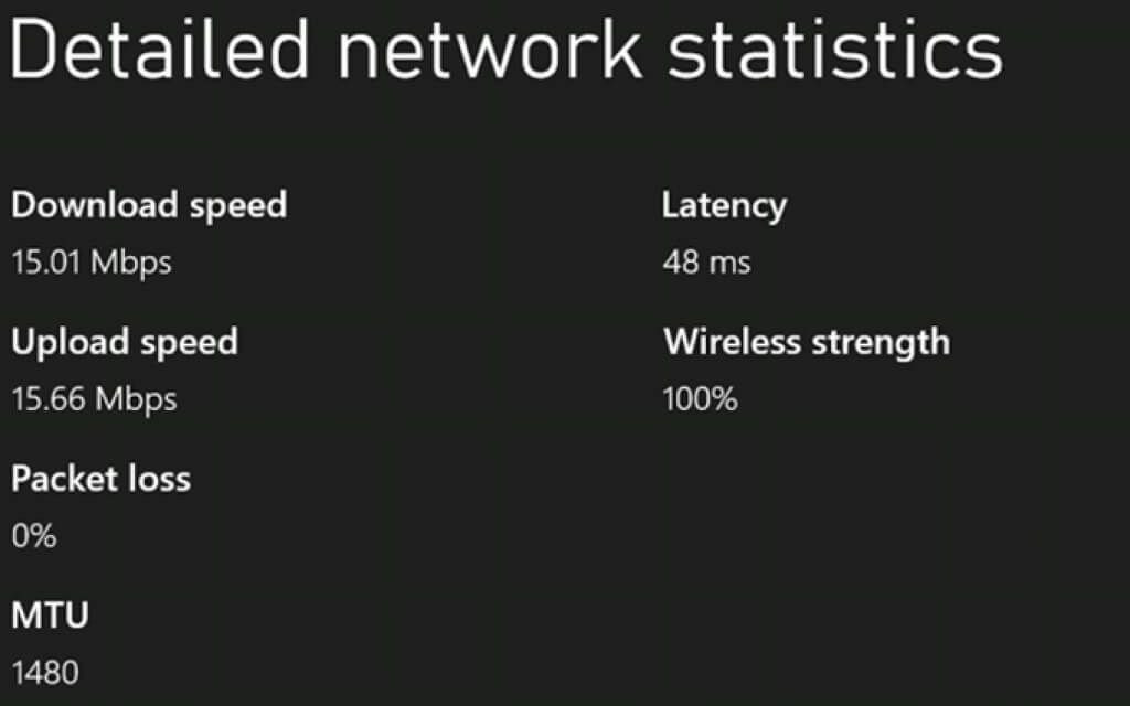 設定> ネットワーク設定> テストネットワークの速度と統計を開きます。テストが終了するのを待ちます。アップロードとダウンロードの速度、遅延など、Xboxのインターネットへの接続に関する情報が提供されます。これらがXboxLiveの最小要件を超えていることを確認してください。
