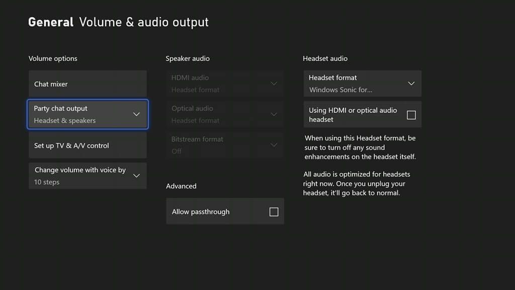 問題は、ヘッドセットにある場合があります。パーティーチャットを調整して、ヘッドセットの代わりにテレビスピーカーから再生するか、両方から同時に再生することができます。