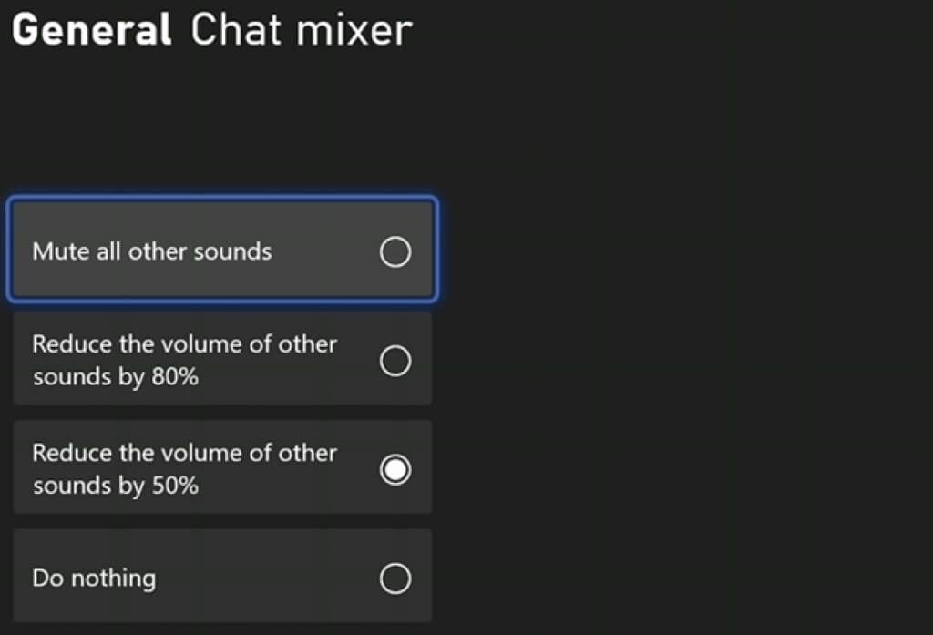 開く設定> 一般> 音量と音声出力> チャットミキサー強い>。表示された設定の1つを選択します。デフォルトでは、Xboxは他のサウンドの音量を50%減らします。 他のすべてのサウンドをミュートすると、選択したときにゲームのノイズがなくなります。音量を下げる他の音は80%、ゲームの音をさらに減衰させます。何もしないと、ヘッドセットを介してゲームを最大音量で再生し続けることができます。