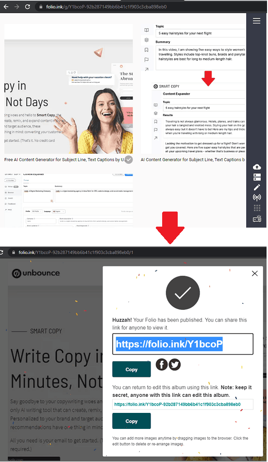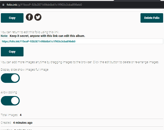 必要な数の写真や画像をアップロードすると、クライアントやチームメートなどと共有できるFolioリンクが表示されます。実際には、2つのリンクが表示され、両方を保持する必要があります。長い文字列を持つ別のリンクは、作成したばかりのポートフォリオを編集またはポートフォリオ化したり、削除したりできる編集リンクです。