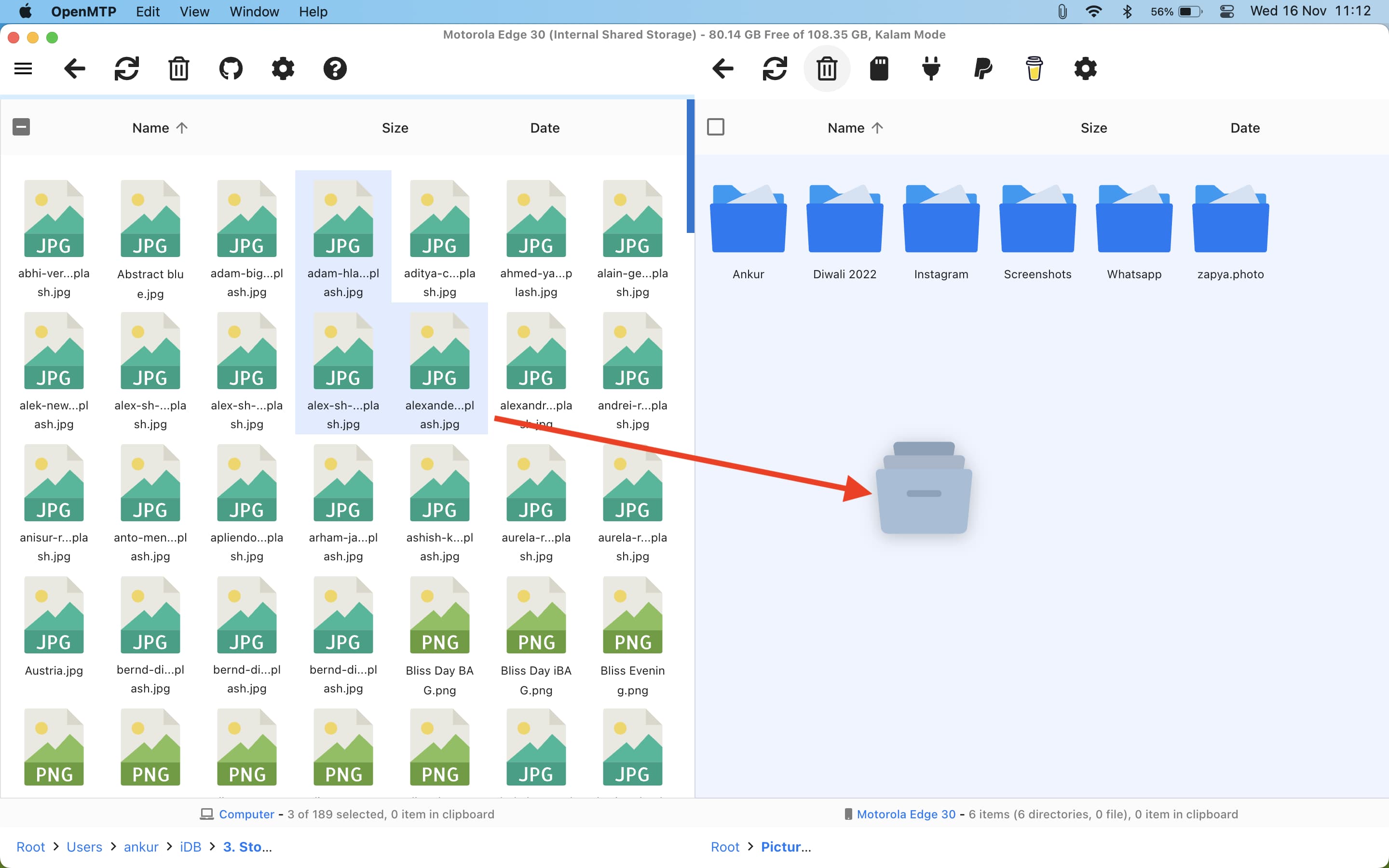 Velg bildene, videoene, lyden, dokumentene osv. fra venstre side og slipp dem på høyre side, dvs. Androids side. For å velge alle synlige filer, bruk Kommando + A eller trykk på den lille firkantede boksen øverst til venstre.
