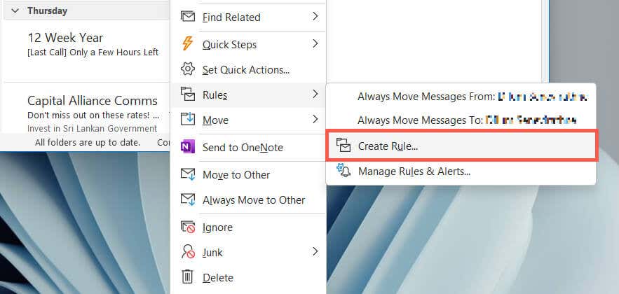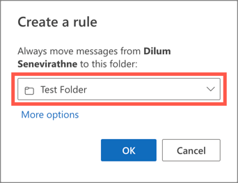 Høyreklikk på en e-post fra avsenderen og velg Avanserte handlinger > Opprett regel. Spesifiser mappen og velg OK.