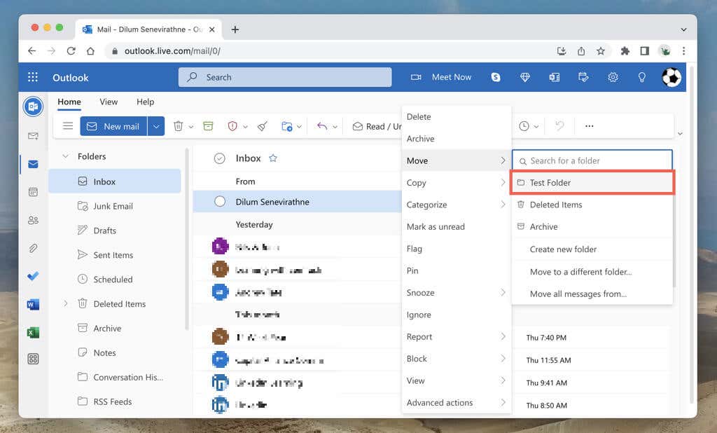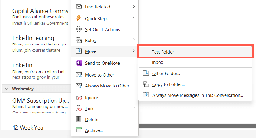Du kan flytte elementer fra innboksen til en egendefinert mappe ved å dra og slipp. Eller høyreklikk på meldingen og velg mappen på undermenyen Flytt.