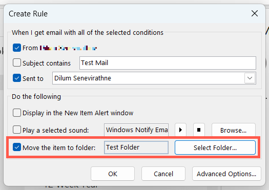 Åpne Innboks-mappen, høyreklikk en e-post fra avsenderen, og velg Regler > Opprett regel. Det bør få opp dialogboksen Opprett regel. Aktiver avmerkingsboksene ved siden av Fra {avsendernavn] og Sendt til. Deretter åpner du Sendt til-rullegardinmenyen og velger e-postkontoen som mottar e-postene fra avsenderen. Aktiver Flytt elementet til mappe-boksen, velg den egendefinerte mappen du vil at Outlook skal flytte e-postene til, og velg OK.