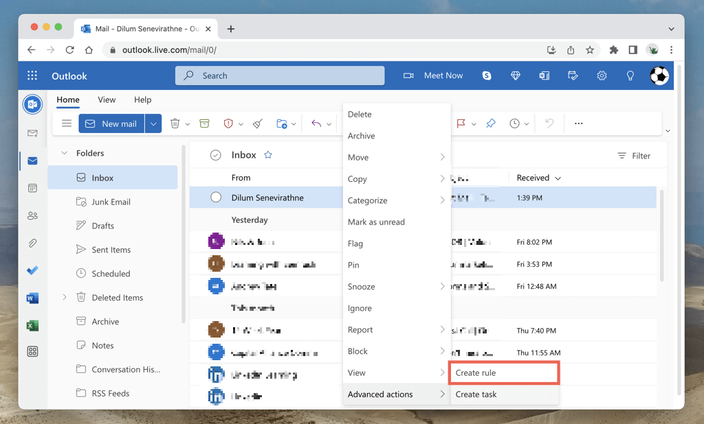 Outlook.com lar deg lage regler som kan flytte nye meldinger fra en kontakt til en egendefinert mappe eller undermappe. Slik oppretter du en regel: