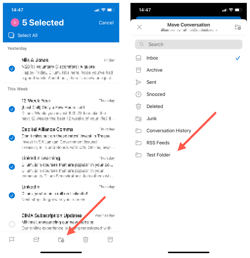 Trykk lenge på en e-post eller velg flere meldinger. Trykk på Flytt-ikonet. Velg mappen.