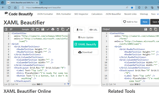 Bu araç özellikle XAML kodunu biçimlendirmek için yapılmıştır. Kodunuzu doğru boşluklar ve aralarla düzenleyecektir. Biçimlendirilmiş kod sağ bölmede görüntülenecektir. Buradan kopyalayabilir, indirebilir ve yalnızca kısa bir süre için kaydedebilirsiniz.