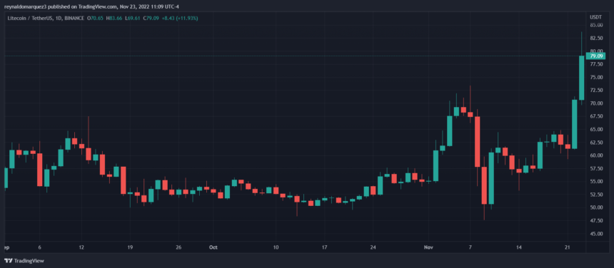 Lanskap pasaran semasa dan aktiviti dalam rantaian menyokong tesis kenaikan harga. Sehingga berita ini ditulis, Litecoin telah mengatasi Solana (SOL) dan Shiba Inu (SHIB) dalam ranking ini. Harga LTC didagangkan pada $78 dengan keuntungan 15% dan 35% dalam 24 jam terakhir dan minggu sebelumnya, masing-masing.