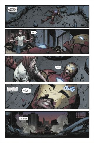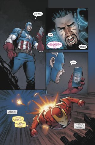 In een van zijn laatste acts voor zijn crash en mogelijke dood, Tony belt Captain America en zegt simpelweg”Avengers Assemble”voordat hij wordt afgesneden door het verlies van elektronica. Hoewel er geen indicatie is van wat er achter de stroomuitval zit, wordt een mysterieuze groene energie gezien die zich verzamelt in de lucht boven Manhattan in de aanloop naar het verlies van elektronica. Net voordat hij het bewustzijn verliest terwijl Pepper over zijn lichaam gaat staan, zegt Tony:”Donker… Het is allemaal donker… Voor altijd.”