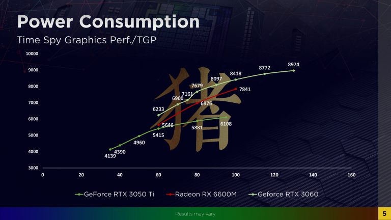 De recensent vergelijkt de GeForce RTX 3050 Ti met een maximale TGP van 80W (+15W Dynamic Boost), RTX 3060 met 115W (+15W met Dynamic Boost), en Radeon RX 6600M op 100W TGP standaard met 20W hoofdruimte met Smart Shift, die deze grafische kaart ondersteunt. Met andere woorden, alle GPU’s draaien op hun volledige potentieel.