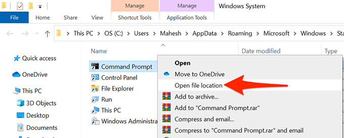 - Een Verkenner-venster wordt geopend met een snelkoppeling naar de opdrachtprompt. Klik hier nogmaals met de rechtermuisknop op de snelkoppeling Opdrachtprompt en selecteer Bestandslocatie openen.