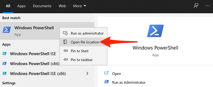 - Klik met de rechtermuisknop op Windows PowerShell in de zoekresultaten en selecteer Bestandslocatie openen.