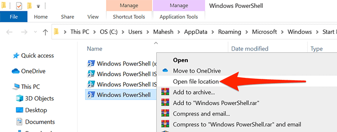 - Klik in het volgende scherm met de rechtermuisknop op Windows PowerShell en selecteer Bestandslocatie openen.