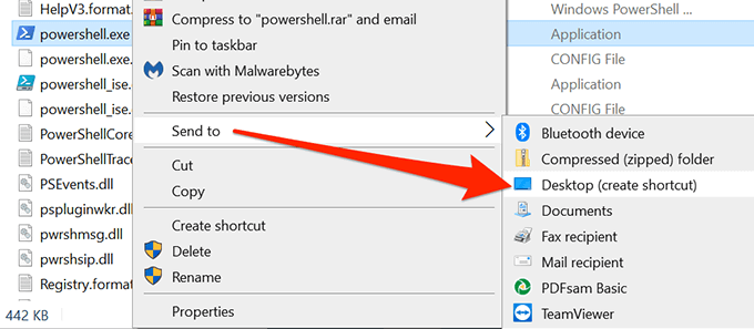 - Je zou nu powershell.exe moeten zien. Klik met de rechtermuisknop op dit bestand en selecteer Verzenden naar > Bureaublad (snelkoppeling maken).